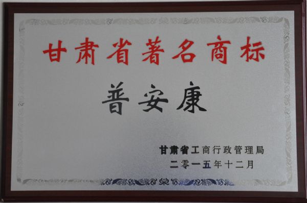 甘肅省工商行政管理局依據(jù)專家組認定意見作出決定,認定我公司“普安康”商標為甘肅省著名商標,公示期滿后于2015年12月給予公司頒發(fā)了《甘肅省著名商標證書》。