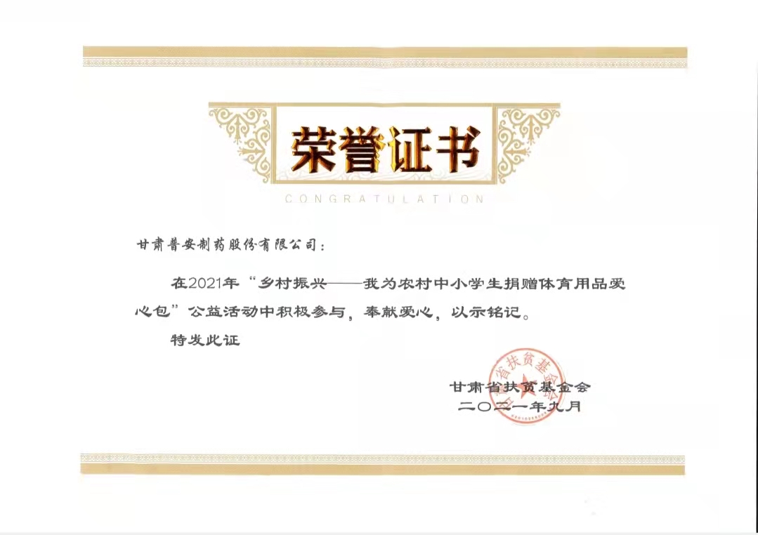 甘肅藥業集團普安制藥(以下簡稱:普安制藥)自成立以來,一直大力弘揚“普惠眾生、安康萬家”的企業理念,本著建設一流制藥企業、提供一流產品服務的目標,堅持黨領導企業,堅持創新發展,穩健經營。在企業發展的同時更是懷有對國家、對民族、對社會的責任和擔當,將“回報于社會”作為一項重要內容。