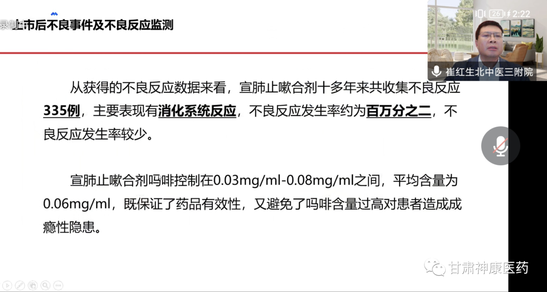 會上,由北京中醫藥大學第三附屬醫院崔紅生教授對宣肺止嗽合劑處方來源、獲獎專利、安全性等做了詳細的介紹。