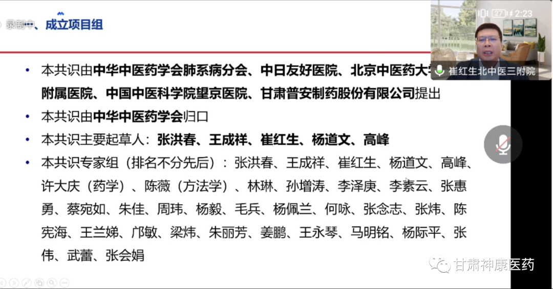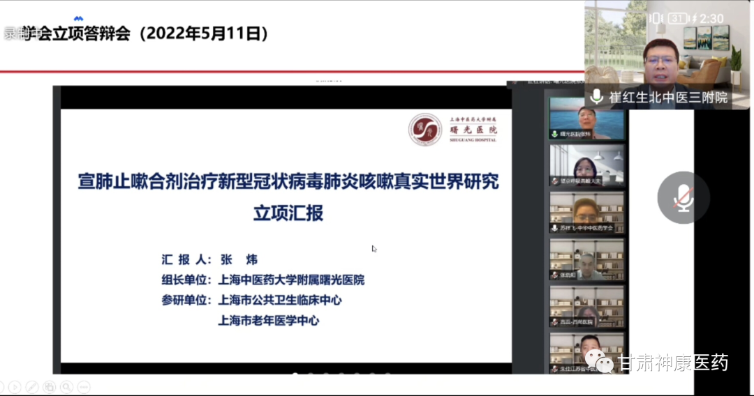 2022年10月21日下午,由中華中醫藥學會主辦,甘肅省普安制藥股份有限公司、北京康眾時代承辦的《宣肺止嗽合劑治療咳嗽臨床應用專家共識》結題答辯會于線上舉行。中華中醫藥學會標準化辦公室負責人蘇祥飛主任,北京中醫藥大學第三附屬醫院王成祥院長、北京中醫藥大學第三附屬醫院崔紅生教授、中日友好醫院楊道文教授、河南中醫大學第一附屬醫院劉向哲教授等專家學者出席會議,會議由蘇祥飛主任主持。