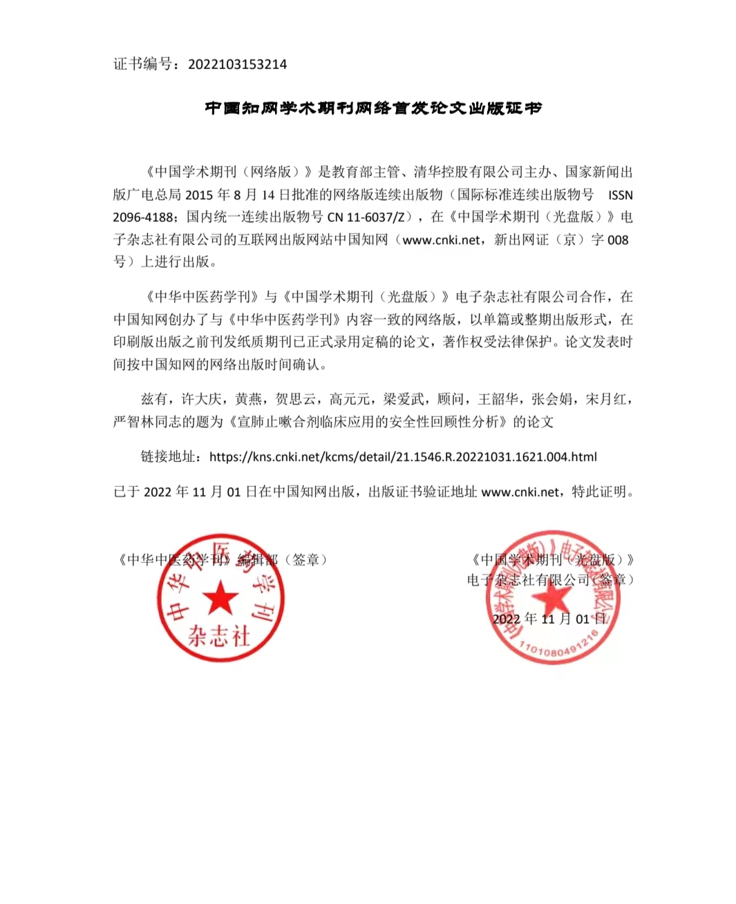 宣肺止嗽合劑真實世界安全性再評價項目產出首篇論文通過網絡首發