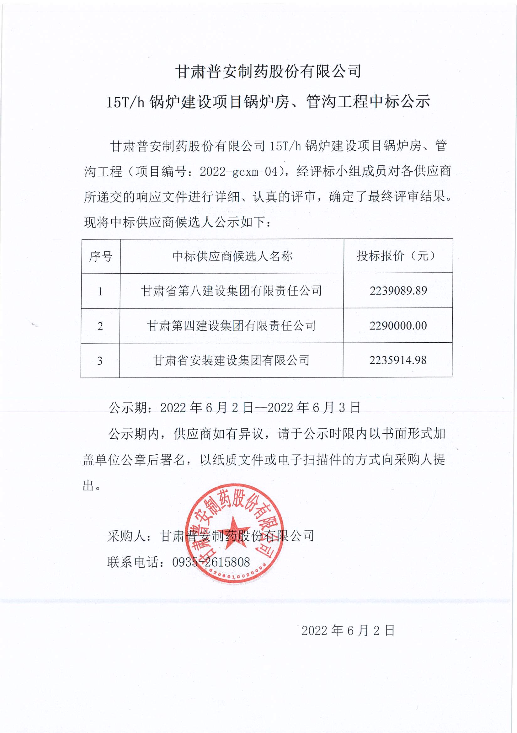 甘肅普安制藥股份有限公司15T/h鍋爐建設項目鍋爐房、管溝工程中標公示