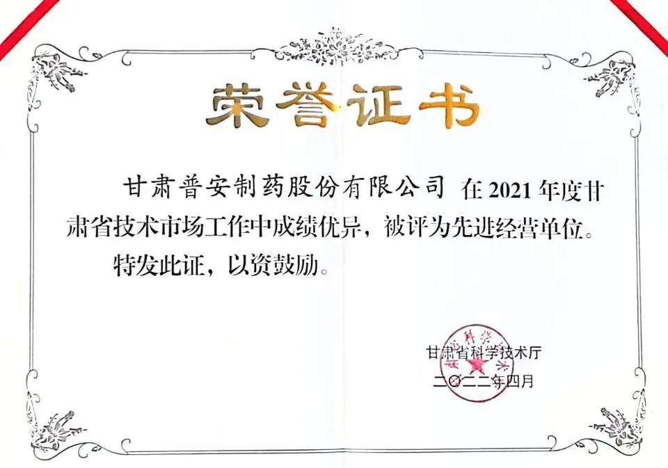 日前,甘肅省科學技術廳通報了2021年度甘肅省技術市場先進經(jīng)營單位,集團公司所屬企業(yè)甘肅普安制藥股份有限公司(以下簡稱“普安制藥”)榮獲2021年度全省技術市場工作先進經(jīng)營單位。
