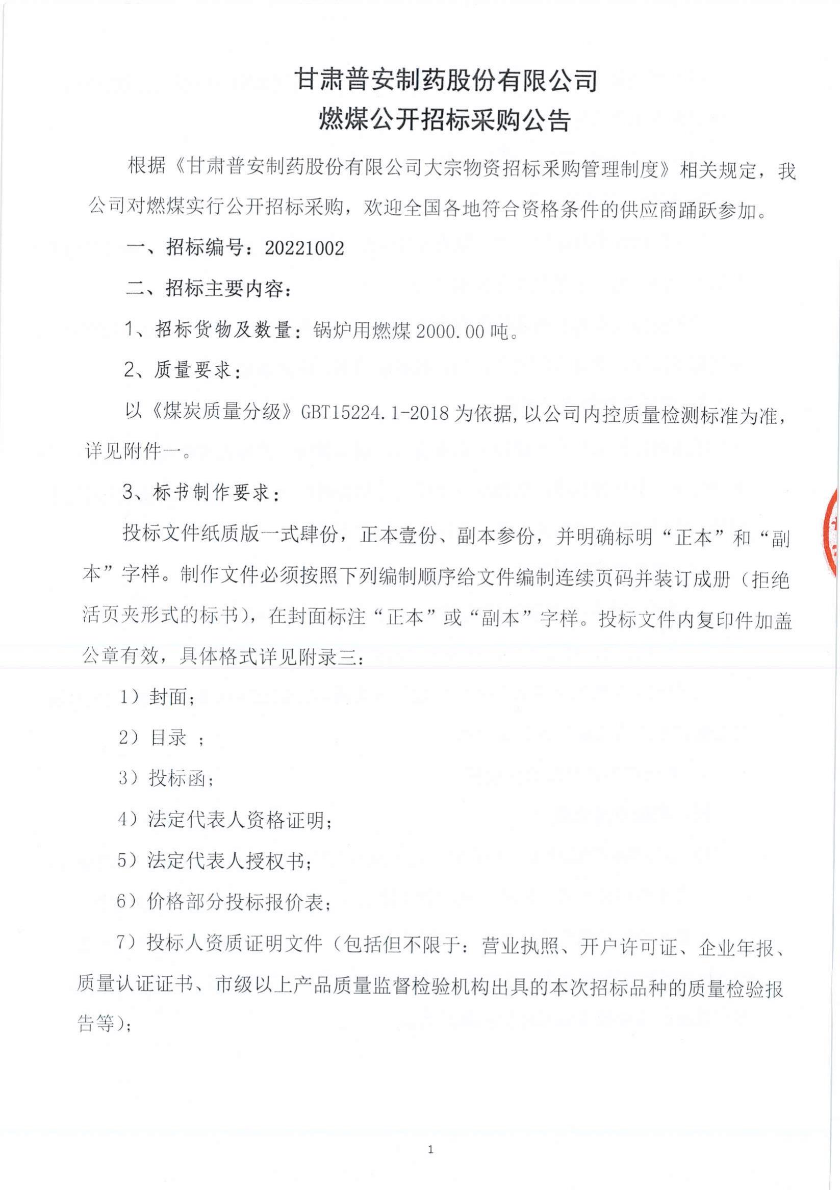 甘肅普安制藥股份有限公司燃煤公開招標(biāo)采購(gòu)公告
