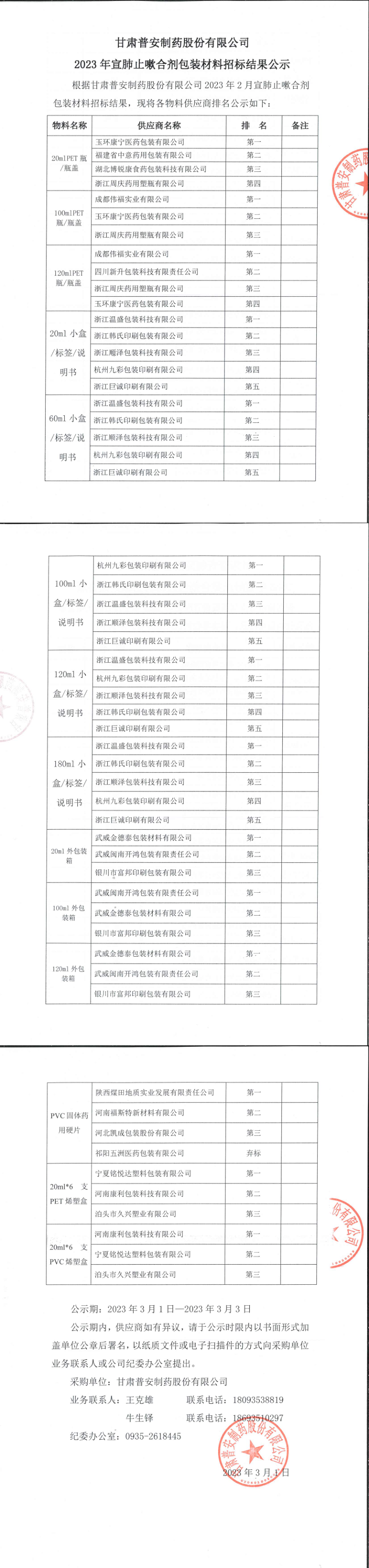 甘肅普安制藥股份有限公司2023年宣肺止嗽合劑包裝材料招標結果公示