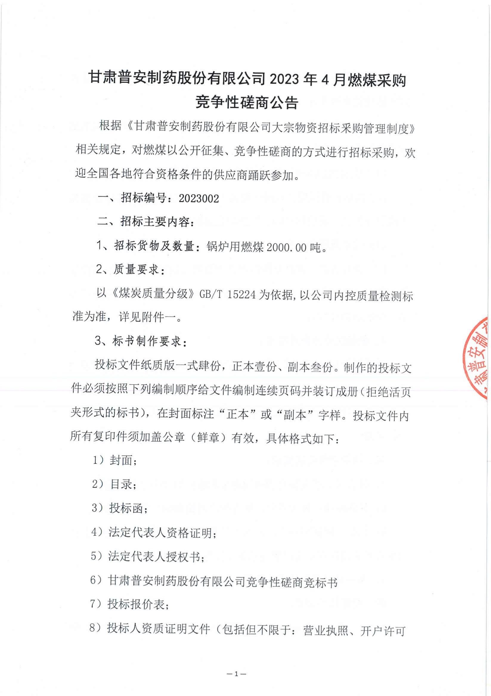 具體內容詳見附件:甘肅普安制藥股份有限公司2023年4月燃煤采購競爭性磋商公告