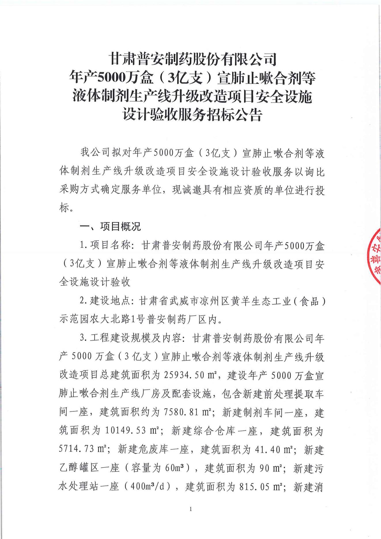甘肅普安制藥股份有限公司年產5000萬盒(3億支)宣肺止嗽合劑等液體制劑生產線升級改造項目安全設施設計驗收服務招標公告