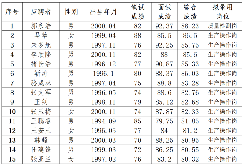 根據(jù)《甘肅藥業(yè)集團(tuán)市場(chǎng)化招聘工作流程》,通過發(fā)布公告、資格審查、組織筆試、面試、體檢等環(huán)節(jié),現(xiàn)將擬招錄的15位人員名單公示如下: