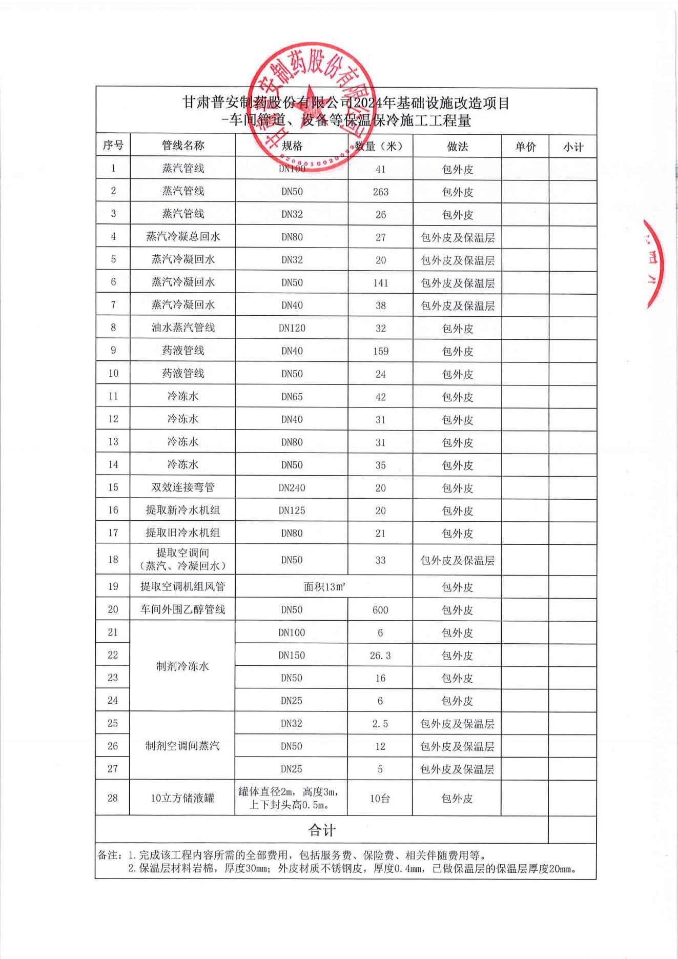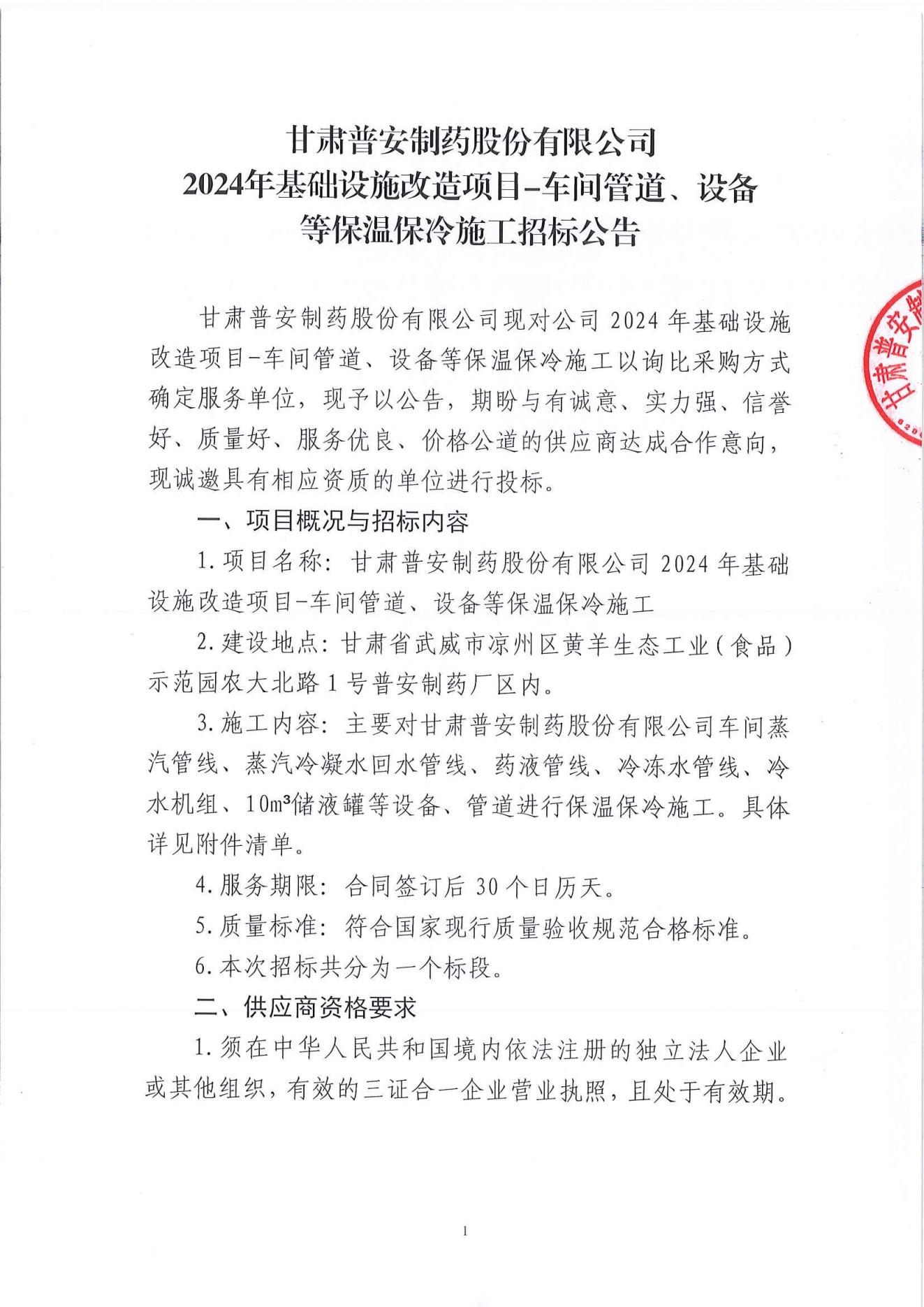甘肅普安制藥股份有限公司2024年基礎(chǔ)設(shè)施改造項(xiàng)目-車間管道、設(shè)備等保溫保冷施工招標(biāo)公告