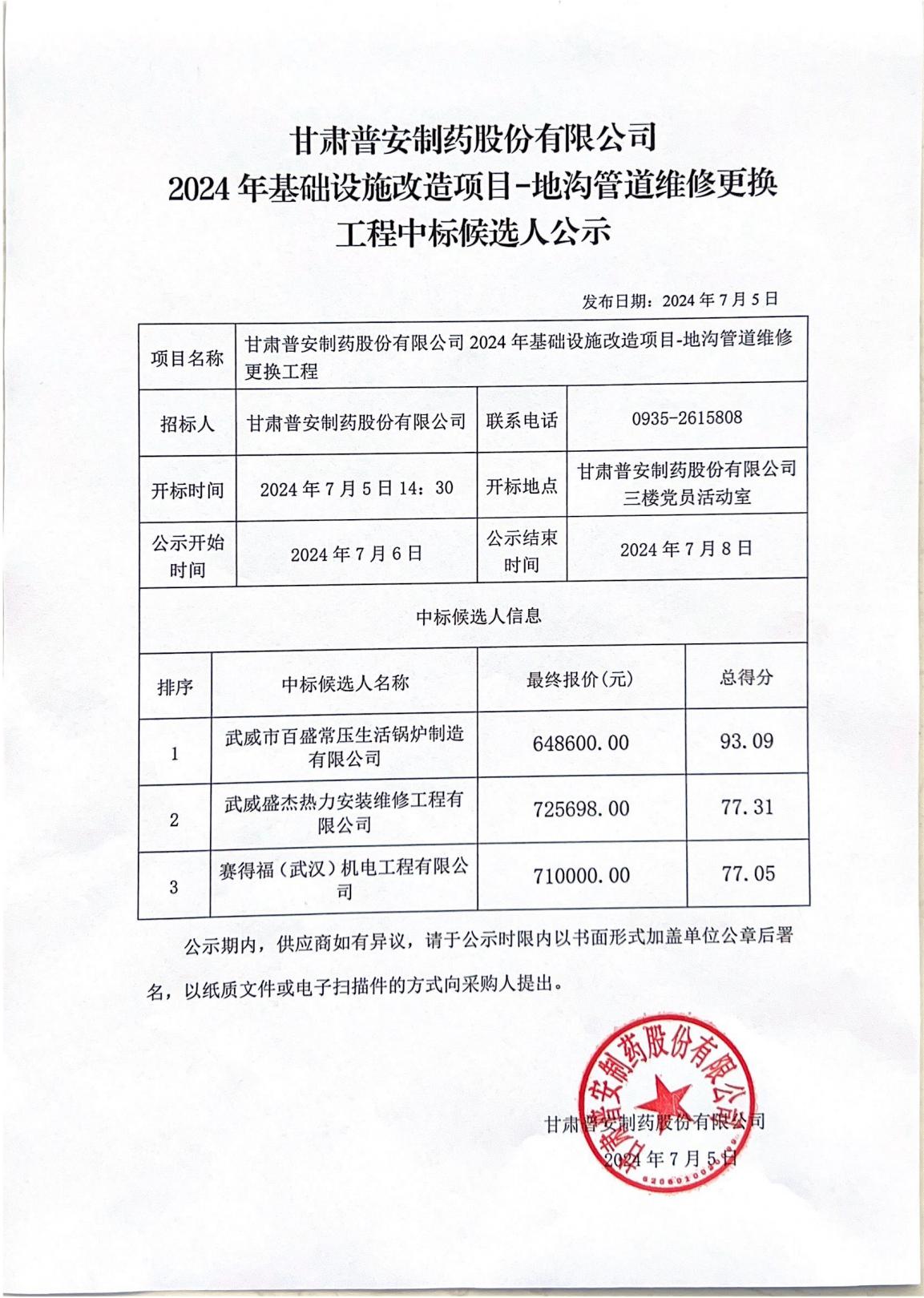 甘肅普安制藥股份有限公司2024年基礎設施改造項目-地溝管道維修更換工程中標候選人公示