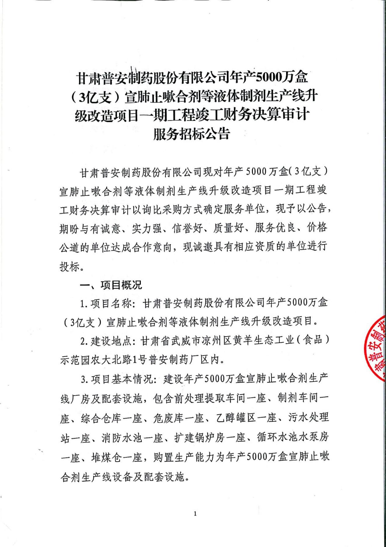 普安制藥年產5000萬盒宣肺止嗽合劑等液體制劑生產線升級改造項目一期竣工決算審計服務招標公告