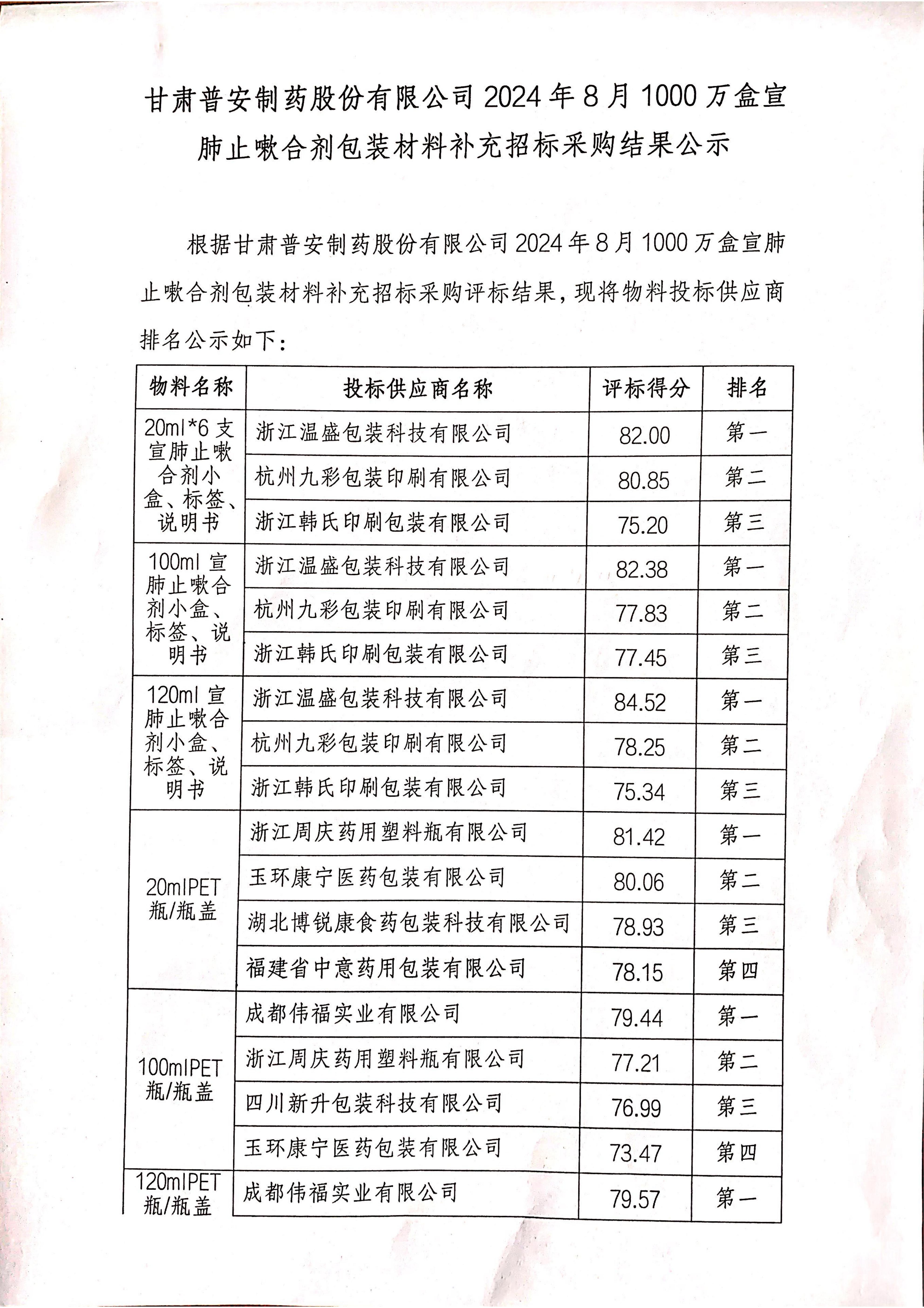 甘肅普安制藥股份有限公司2024年8月1000萬盒宣肺止嗽合劑包裝材料補充招標(biāo)采購結(jié)果公示