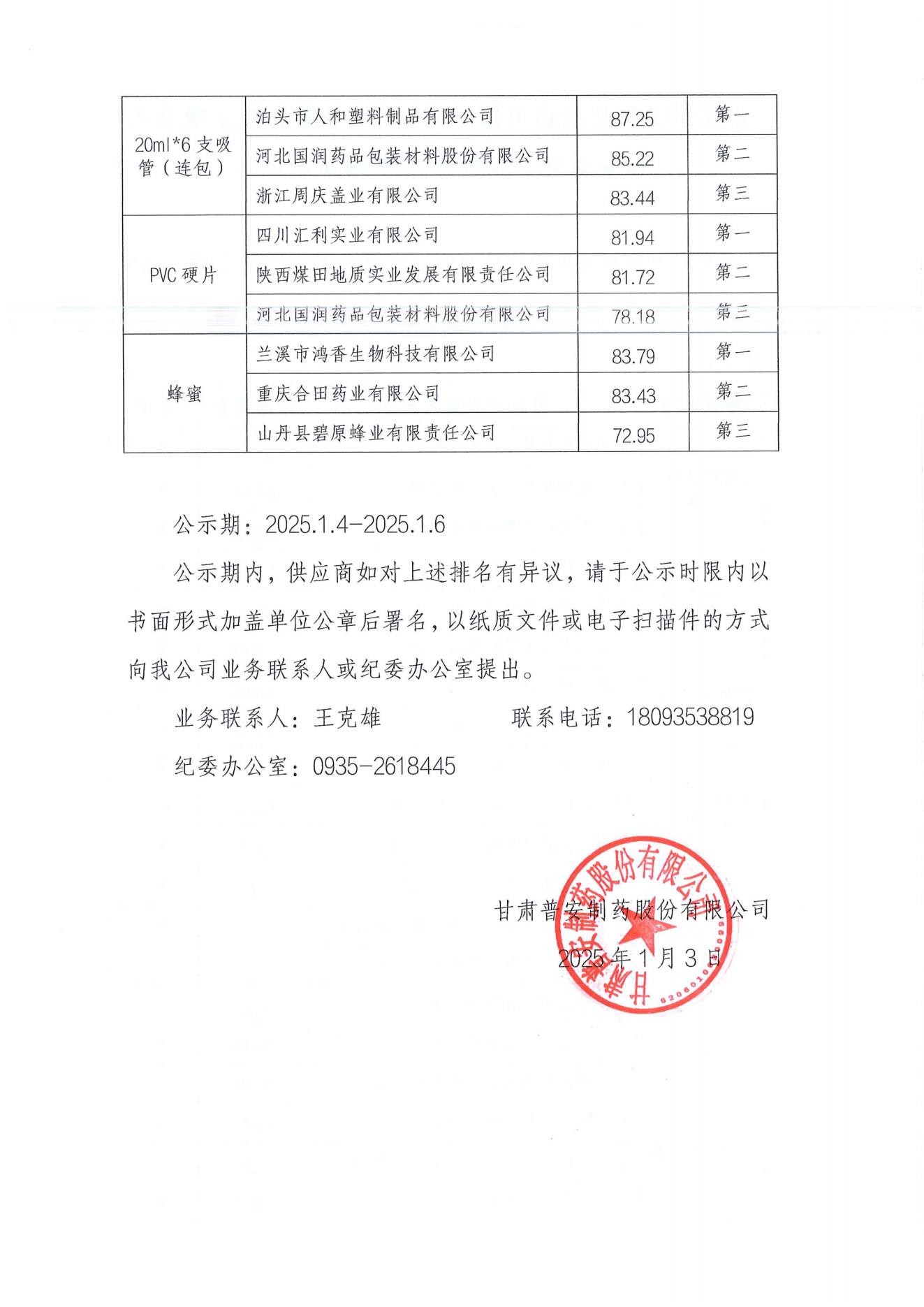 甘肅普安制藥股份有限公司2025年度宣肺止嗽合劑包裝材料、輔料招標采購結果公示